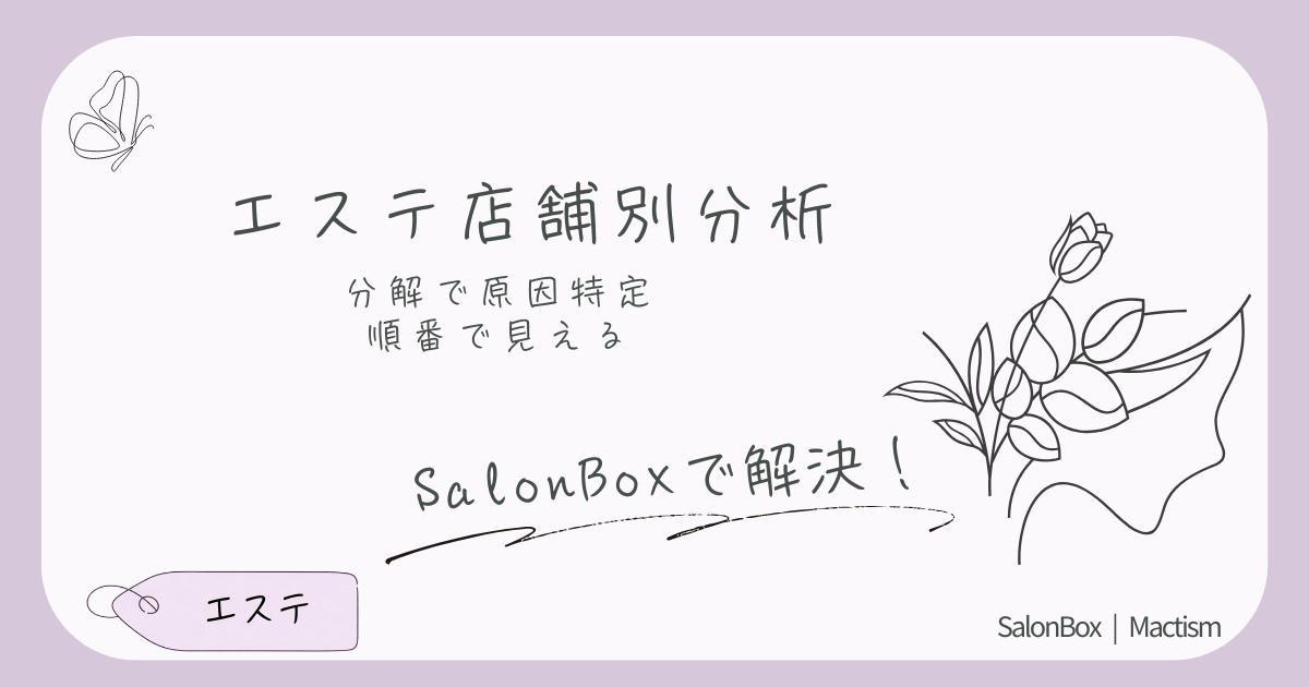 エステの店舗別売上差は、分解の順番を固定すると原因が明確になります。売上→客数→客単価→粗利→達成率で分析し、勝ち店舗の型を横展開する実務手順を解説します。