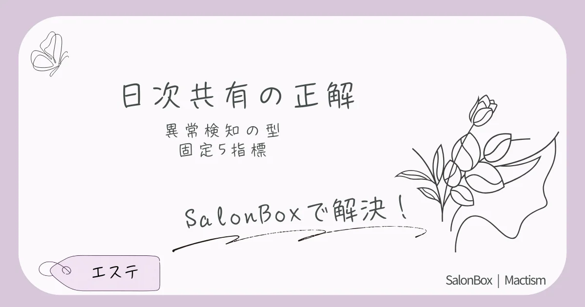 エステの日次売上共有は、指標・通知先・例外処理を固定するだけで回り始めます。日次を異常検知に使い、週次・月次へつなぐ運用の型を解説。
